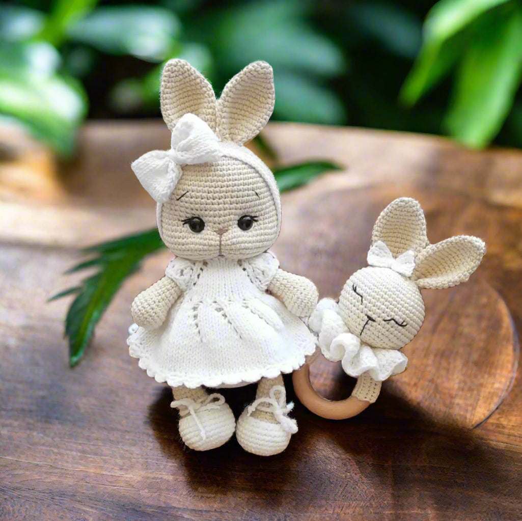 Crochet Cute Bunny Toy in Fancy White Dress and Rattle Toy Set 2pc