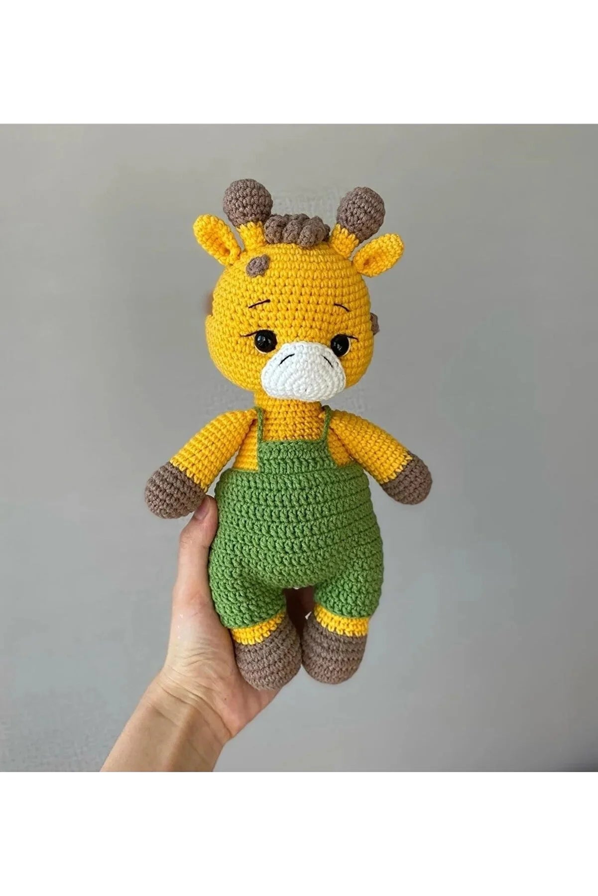 Add some "giraffe"ic to your playtime with this Crochet Cute Giraffe! Wearing a trendy green jumpsuit, this adorable toy is perfect for snuggles and imaginative adventures. Handmade with love, this unique toy is sure to bring joy and smiles to children (and adults) of all ages.