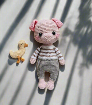This adorable crochet toy features a cute piglet and his small chick companion. Hand-crafted with soft materials, this toy is perfect for cuddling and imaginative play. Its intricate design makes it a unique addition to any collection. Bring joy and creativity to your child's playtime with this charming duo.
