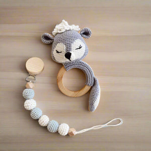 Crochet Raccoon Rattle Toy and Dummy Clip 2pc