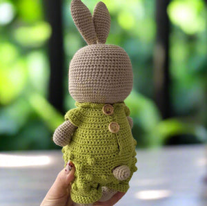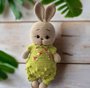 This adorable bunny is hand-crocheted in a delightful green jumpsuit with charming mushroom accents. Perfect for any animal lover, it brings an element of whimsy and personality to any room. Get ready for some serious cuteness overload!????