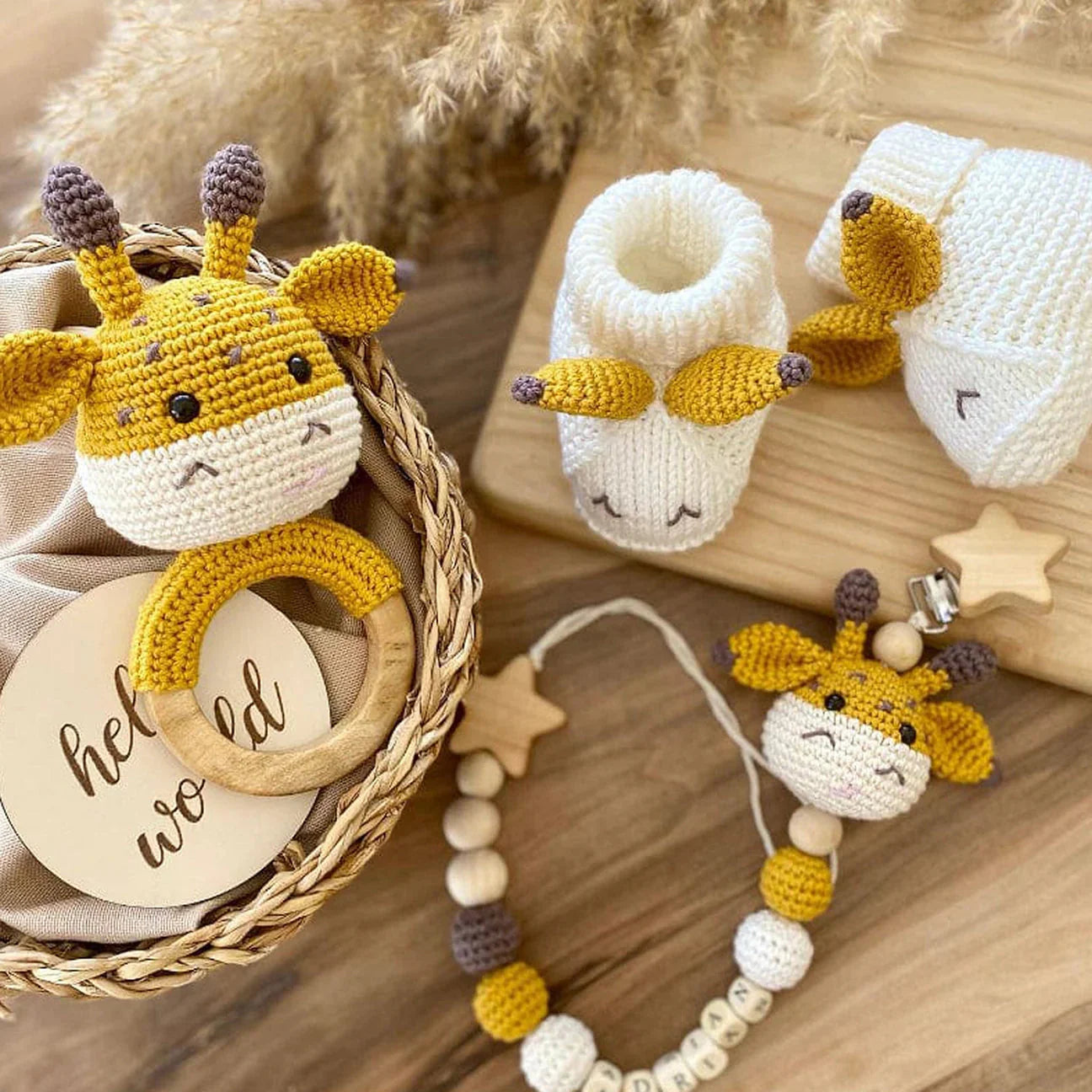 Handmade Crochet Giraffe Toy Gift Set (3pc) - Personalised Dummy Clip