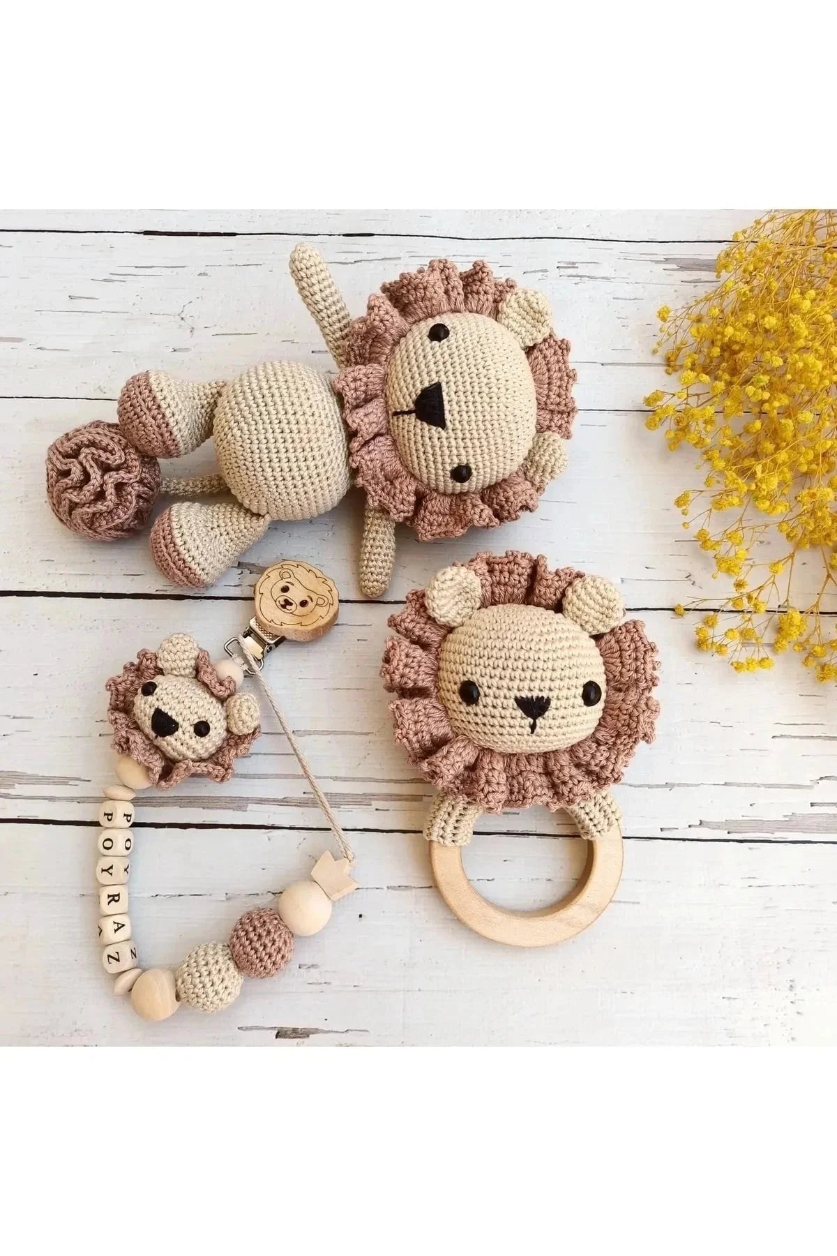 Handmade Crochet Lion Toy Gift Set (3pc) - Personalised Dummy Clip