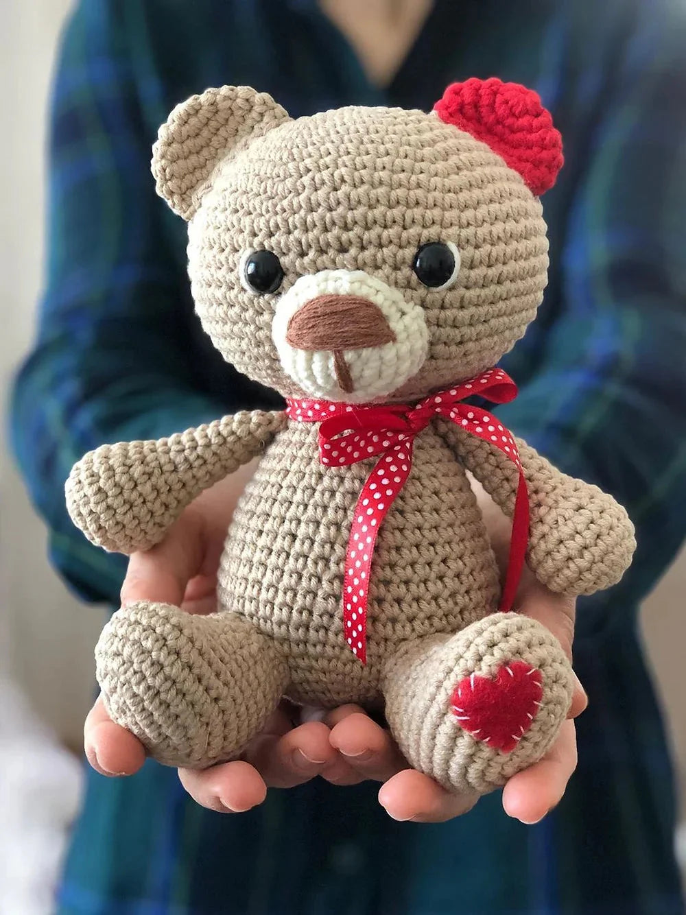 Valentine’s Style Crochet Teddy Bear – Heart Feet & Red Bow